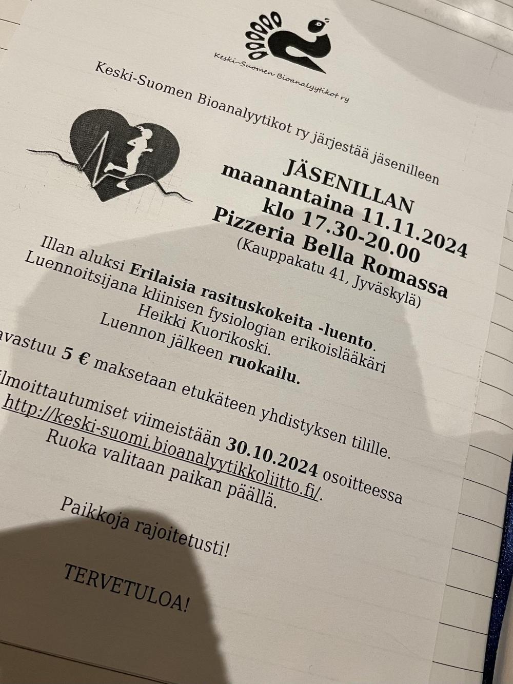 Keski-Suomen Bioanalyytikot ry järjesti jäsenilleen jäsenillan maanantaina 11.11.2024 klo 17.30-20.00 Pizzeria Bella Romassa (Kauppakatu 41, Jyväskylä).